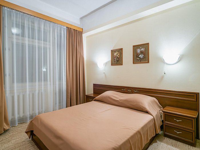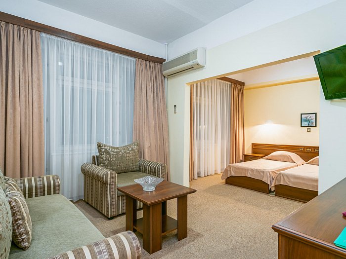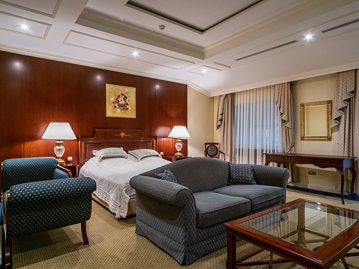 В номере: две комнаты: спальня и гостиная, односпальные кровати или одна двуспальная, прикроватные тумбы, зеркало, шкаф для одежды, мягкая мебель, журнальный стол, сейф, письменный стол, телевизор, кондиционер, фен, холодильник, Wi-Fi