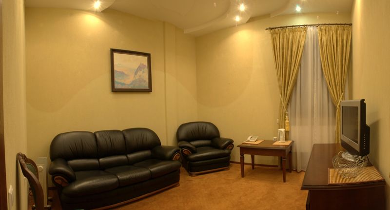 Оснащение номера: двуспальная кровать, прикроватные тумбочки, стол, стулья, шкаф для одежды, диван, сейф, система кондиционирования, телевизор, телефон, холодильник, электрический чайник