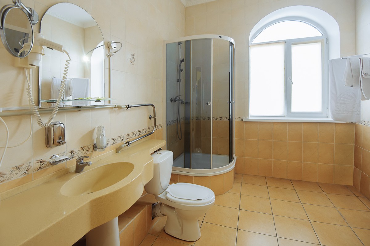 Сан-узел: ванная комната, с набором полотенец, индивидуальные наборы косметики, унитаз, фен.
