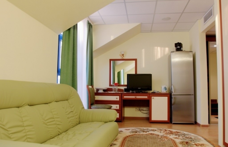 В номере: двуспальная кровать, набор мягкой мебели, стулья, телевизор, холодильник, электрочайник, набор посуды.